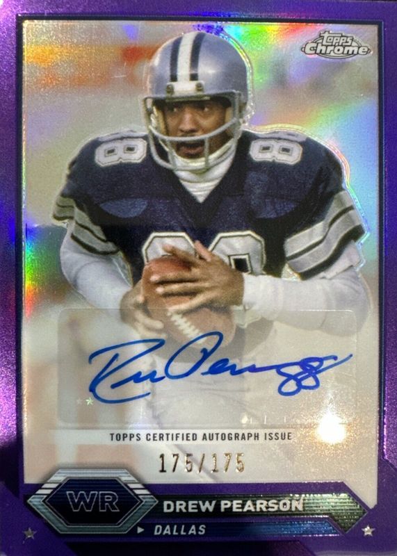 The Drew Pearson 2023 Topps Composite #TCA-DPE Chrome Autographs - Purple Refractor /175 card in Raw condition has not changed in price in the last 30 days and was last sold for $7.99 .