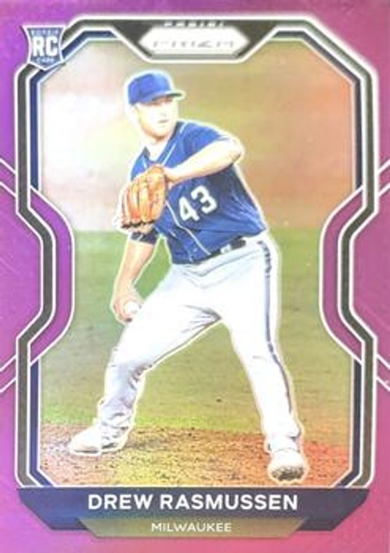 The Drew Rasmussen 2021 Prizm #197 Purple Rookie card is 1 of 69 Drew Rasmussen's card variations in the 2021 Prizm set being tracked by Sports Card Investor, including Base, Blue, Blue Velocity, Carolina Blue, and Cosmic Haze.