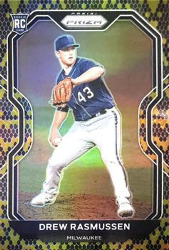 The Drew Rasmussen 2021 Prizm #197 Snakeskin /50 Rookie card is 1 of 69 Drew Rasmussen's card variations in the 2021 Prizm set being tracked by Sports Card Investor, including Base, Blue, Blue Velocity, Carolina Blue, and Cosmic Haze.