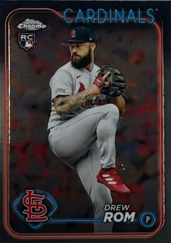 The Drew Rom 2024 Topps Chrome #195 Base Rookie card is 1 of 18 Drew Rom's card variations in the 2024 Topps Chrome set being tracked by Sports Card Investor, including Pink Refractor, Prism Refractor, X Fractor, Aqua Lava Refractor /199, and Aqua RayWave Refractor /199.