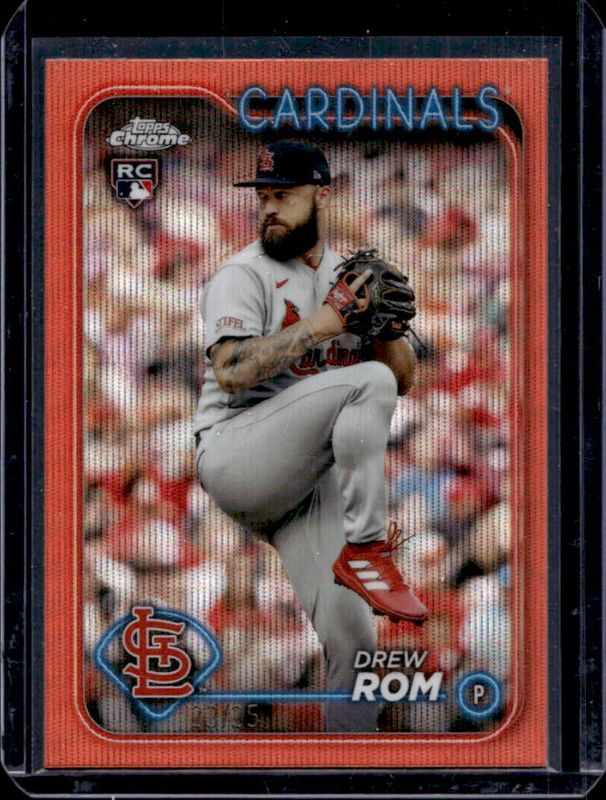 The Drew Rom 2024 Topps Chrome #195 Orange Wave Refractor /25 Rookie card is 1 of 18 Drew Rom's card variations in the 2024 Topps Chrome set being tracked by Sports Card Investor, including Base, Pink Refractor, Prism Refractor, X Fractor, and Aqua Lava Refractor /199.