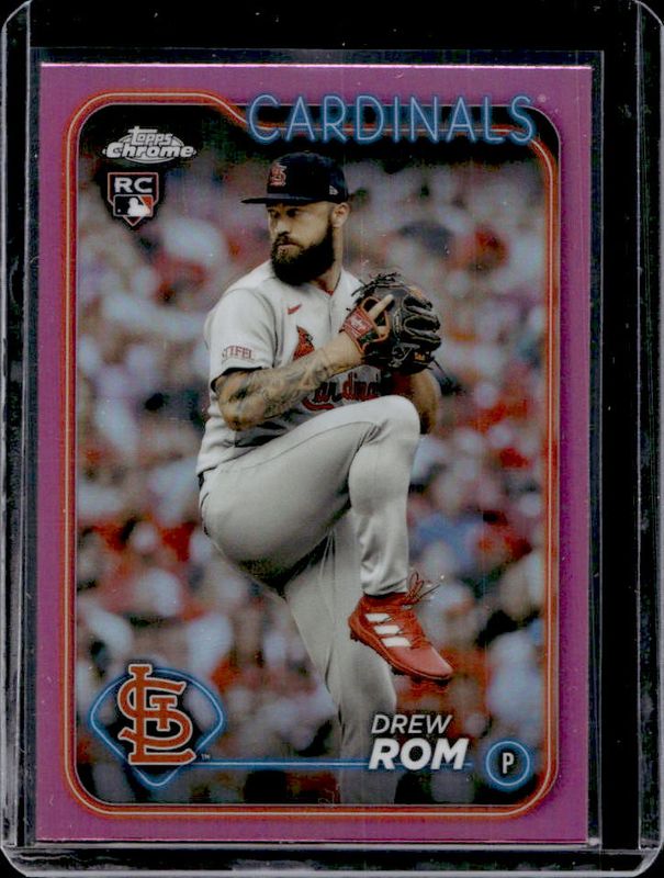 The Drew Rom 2024 Topps Chrome #195 Pink Refractor Rookie card is 1 of 18 Drew Rom's card variations in the 2024 Topps Chrome set being tracked by Sports Card Investor, including Base, Prism Refractor, X Fractor, Aqua Lava Refractor /199, and Aqua RayWave Refractor /199.