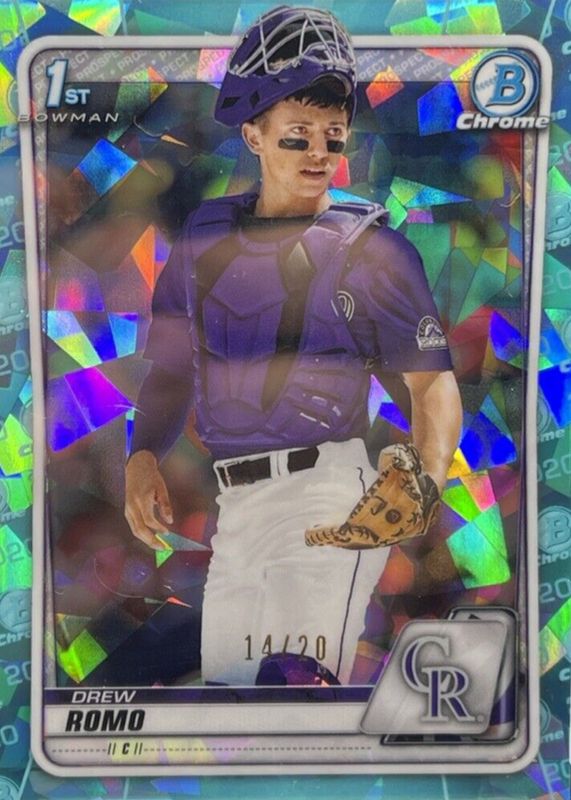 This card is 1 of 9 Drew Romo's card variations in the 2020 Bowman Draft Sapphire Edition set being tracked by Sports Card Investor, including Chrome (1st), Chrome - Yellow /99 (1st), Chrome - Green /50 (1st), Chrome - Orange /25 (1st), and Chrome - Gold /15 (1st).