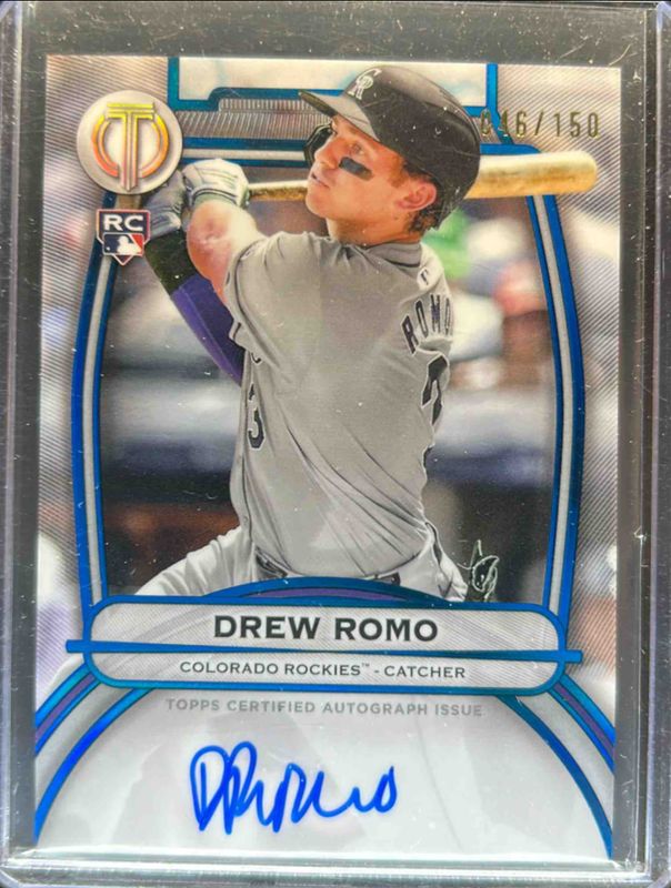 The Drew Romo 2025 Topps Tribute #TA-DR Tribute Autograph - Blue /150 Rookie card is 1 of 12 Drew Romo's card variations in the 2025 Topps Tribute set being tracked by Sports Card Investor, including Tribute Autograph /199, Tribute Autograph - Green /99, Tribute Autograph - Gold /75, Tribute Autograph - Purple /50, and Tribute Autograph - Orange /25.