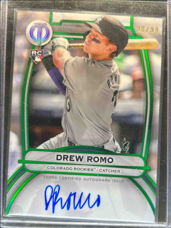 The Drew Romo 2025 Topps Tribute #TA-DR Tribute Autograph - Green /99 Rookie card is 1 of 12 Drew Romo's card variations in the 2025 Topps Tribute set being tracked by Sports Card Investor, including Tribute Autograph /199, Tribute Autograph - Blue /150, Tribute Autograph - Gold /75, Tribute Autograph - Purple /50, and Tribute Autograph - Orange /25.