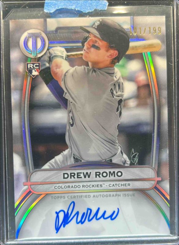 The Drew Romo 2025 Topps Tribute #TA-DR Tribute Autograph /199 Rookie card is 1 of 12 Drew Romo's card variations in the 2025 Topps Tribute set being tracked by Sports Card Investor, including Tribute Autograph - Blue /150, Tribute Autograph - Green /99, Tribute Autograph - Gold /75, Tribute Autograph - Purple /50, and Tribute Autograph - Orange /25.