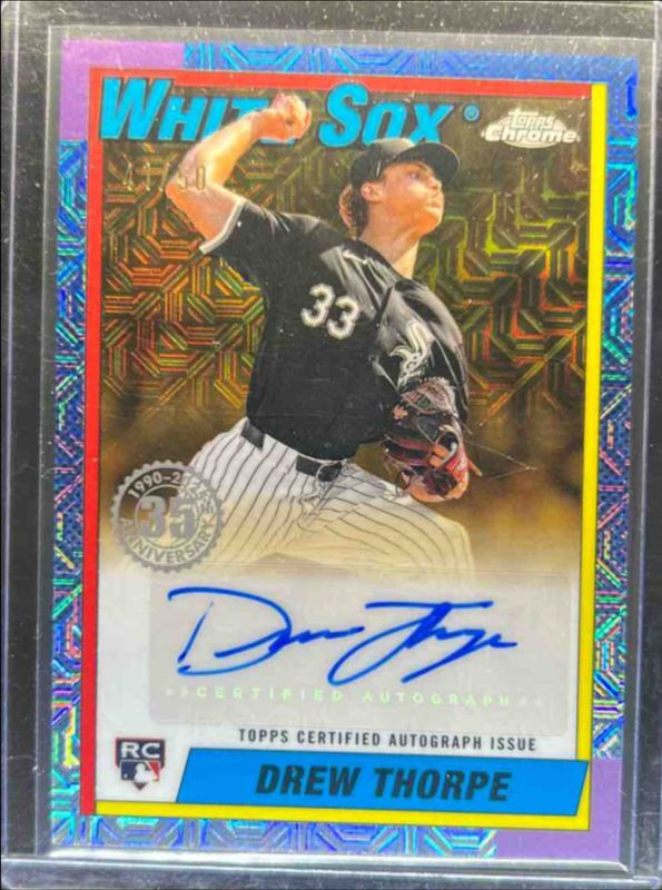 The Drew Thorpe 2025 Topps #90CA-DT 1990 Baseball Chrome Silver Pack Autographs (Series 1) - Gold Refractor /50 Rookie card is 1 of 137 Drew Thorpe's card variations in the 2025 Topps set being tracked by Sports Card Investor, including Base, Aqua Holo Foil, Aqua Rainbow, Diamante Foil, and Eggs.