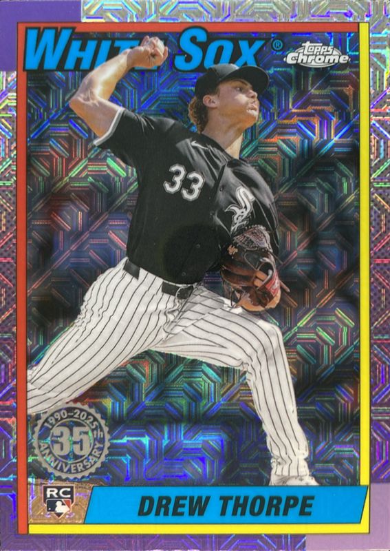 The Drew Thorpe 2025 Topps #T90C-20 1990 Baseball Chrome Silver Pack Rookie card is 1 of 137 Drew Thorpe's card variations in the 2025 Topps set being tracked by Sports Card Investor, including Base, Aqua Holo Foil, Aqua Rainbow, Diamante Foil, and Eggs.
