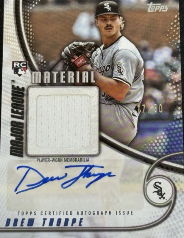 The Drew Thorpe 2025 Topps #MLMA2-DT Major League Material Autographs (Series Two) /50 Rookie card is 1 of 137 Drew Thorpe's card variations in the 2025 Topps set being tracked by Sports Card Investor, including Base, Aqua Holo Foil, Aqua Rainbow, Diamante Foil, and Eggs.