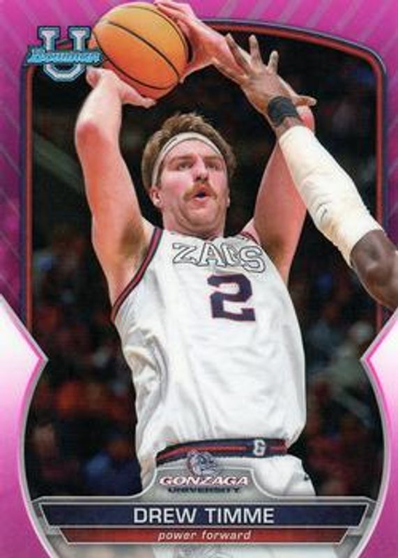 The Drew Timme 2022 Bowman Chrome University #61 Pink Refractor card is 1 of 55 Drew Timme's card variations in the 2022 Bowman Chrome University set being tracked by Sports Card Investor, including Base, Purple Shimmer Refractor, Refractor, Shimmer Refractor, and Purple Mini-Diamond Refractor /399.