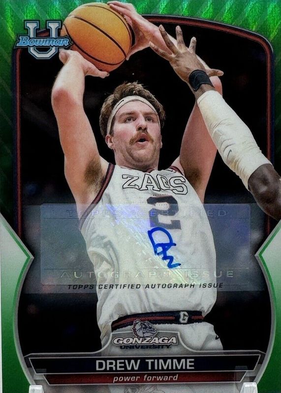 The Drew Timme 2022 Bowman Chrome University #61 Prospect Autographs - Green Refractor /99 card in Raw condition has not changed in price in the last 30 days and was last sold for $23.24 .