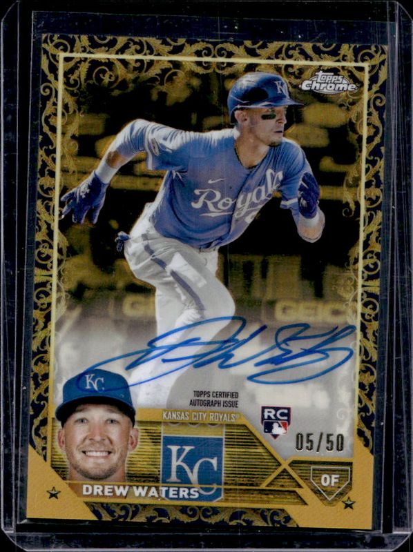 The Drew Waters 2023 Topps Gilded Collection #CGA-DW Chrome Gold Etch Autographs - Blue Refractor /50 Rookie card is 1 of 12 Drew Waters' card variations in the 2023 Topps Gilded Collection set being tracked by Sports Card Investor, including Base /99, Wave Gold Etch Refractor /75, Mini-Diamond Gold Etch Refractor /50, RayWave Gold Etch Refractor /25, and Lava Gold Etch Refractor /10.