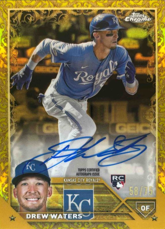 The Drew Waters 2023 Topps Gilded Collection #CGA-DW Chrome Gold Etch Autographs - Yellow Refractor /75 Rookie card is 1 of 12 Drew Waters' card variations in the 2023 Topps Gilded Collection set being tracked by Sports Card Investor, including Base /99, Wave Gold Etch Refractor /75, Mini-Diamond Gold Etch Refractor /50, RayWave Gold Etch Refractor /25, and Lava Gold Etch Refractor /10.