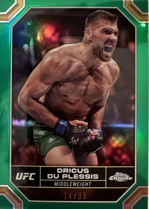 The Dricus du Plessis 2024 Topps Chrome UFC #62 Green Refractor /99 card in Raw condition has not changed in price in the last 30 days and was last sold for $16.00 .