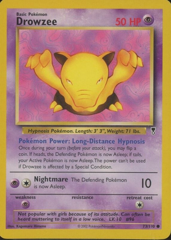The Drowzee 2002 Legendary Collection #73 Base card in Raw TCG (Near Mint) condition has not changed in price in the last 30 days and was last sold for $1.59 .