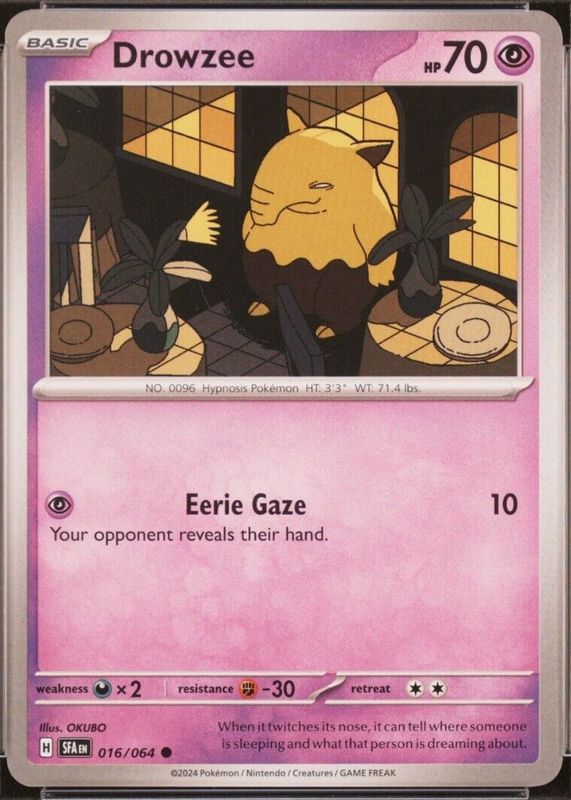 This card is 1 of 2 Drowzee's card variations in the 2024 Scarlet & Violet: Shrouded Fable set being tracked by Sports Card Investor, including Reverse Holo.