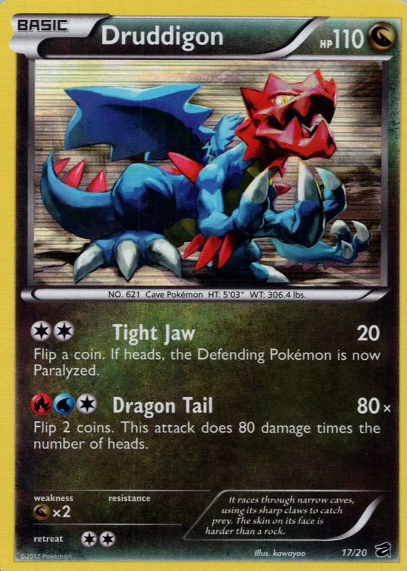 The Druddigon 2012 Black & White: Dragon Vault #17/20 Holo card in Raw TCG (Lightly Played) condition has moved up $1.16 (+33.1%) in the last 30 days and was last sold for $4.66 .