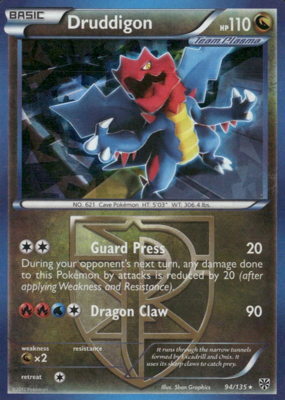 The Druddigon 2013 Black & White: Plasma Storm #094/135 Base card in Raw TCG (Near Mint) condition has moved down -$0.04 (-3.1%) in the last 30 days and was last sold for $1.25 .