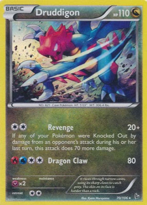 The Druddigon 2014 XY: Flashfire #070/106 Holo card in Raw TCG (Lightly Played) condition has not changed in price in the last 30 days and was last sold for $1.99 .
