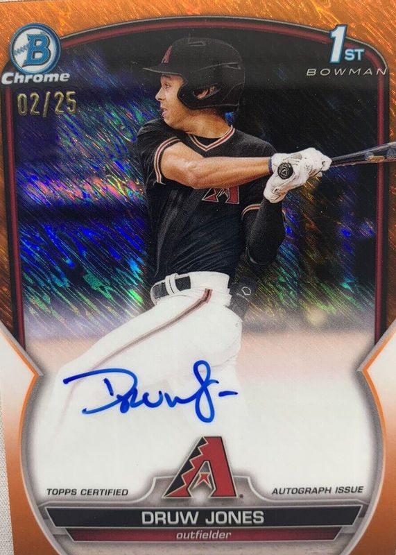 Auctions Ending Soon for Druw Jones 2023 Bowman #CPA-DJ Chrome Prospect Auto - Orange Shimmer Refractor /25 (1st) RAW