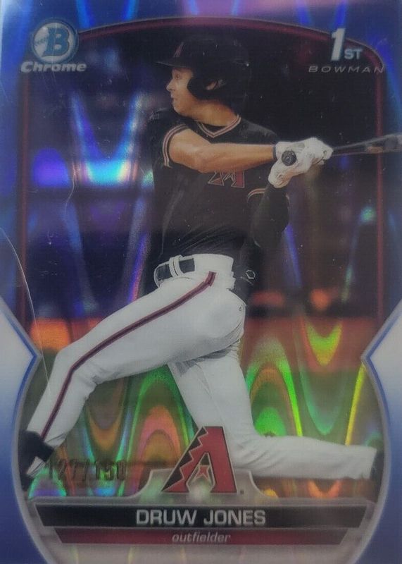 The Druw Jones 2023 Bowman #BCP-25 Chrome Prospects - Blue RayWave Refractor /150 (1st) card in Raw condition has not changed in price in the last 30 days and was last sold for $12.00 .