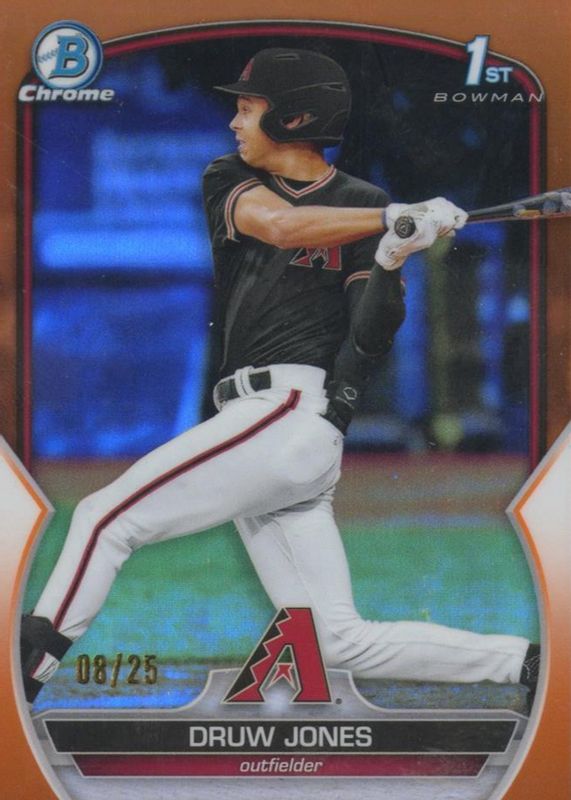 The Druw Jones 2023 Bowman #BCP-25 Chrome Prospects - Orange Refractor /25 (1st) card in Raw condition has not changed in price in the last 30 days and was last sold for $129.95 .