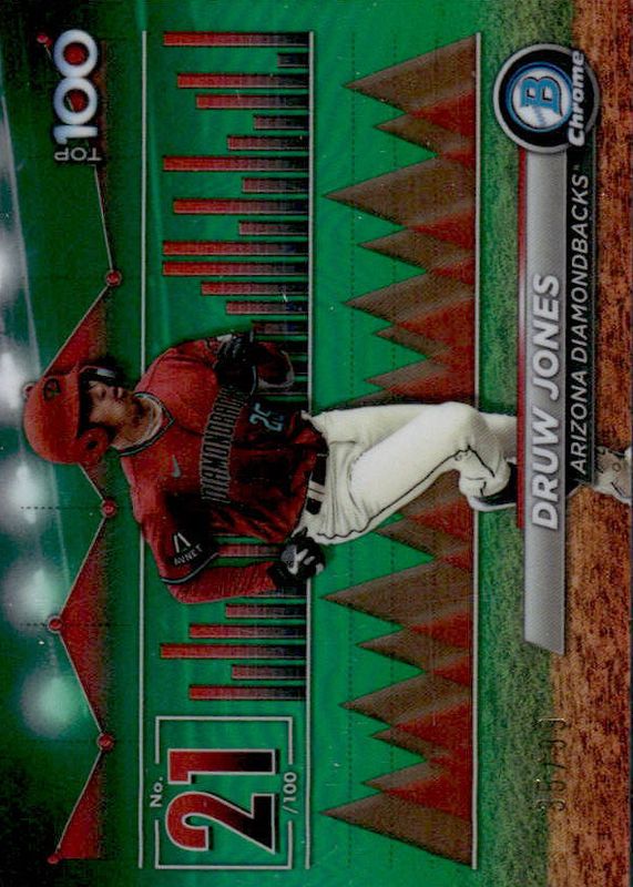 The Druw Jones 2024 Bowman #BTP-21 Bowman Scouts' Top 100 - Green Refractor /99 card in Raw condition has not changed in price in the last 30 days and was last sold for $5.51 .