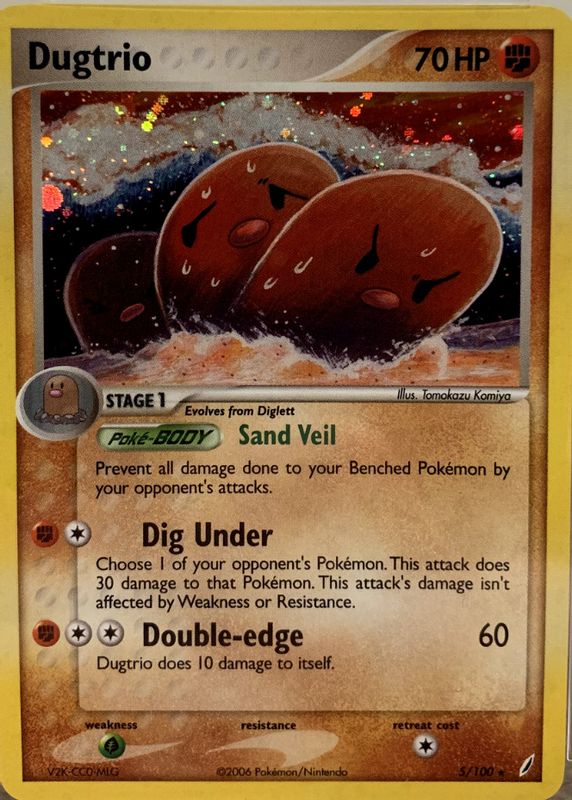 The Dugtrio 2006 EX: Crystal Guardians #005/100 Holo card in Raw TCG (Near Mint) condition has moved up $4.39 (+51.0%) in the last 30 days and was last sold for $13.00 .