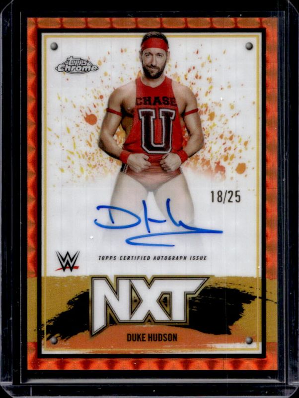The Duke Hudson 2025 Topps Chrome WWE #NXT-DHD NXT Chrome Autographs - Orange Geometric Refractor /25 card is 1 of 50 Duke Hudson's card variations in the 2025 Topps Chrome WWE set being tracked by Sports Card Investor, including Base, Black & Gold Refractor, Geometric Refractor, Neon Green & Black Refractor, and Pink Shimmer Refractor.