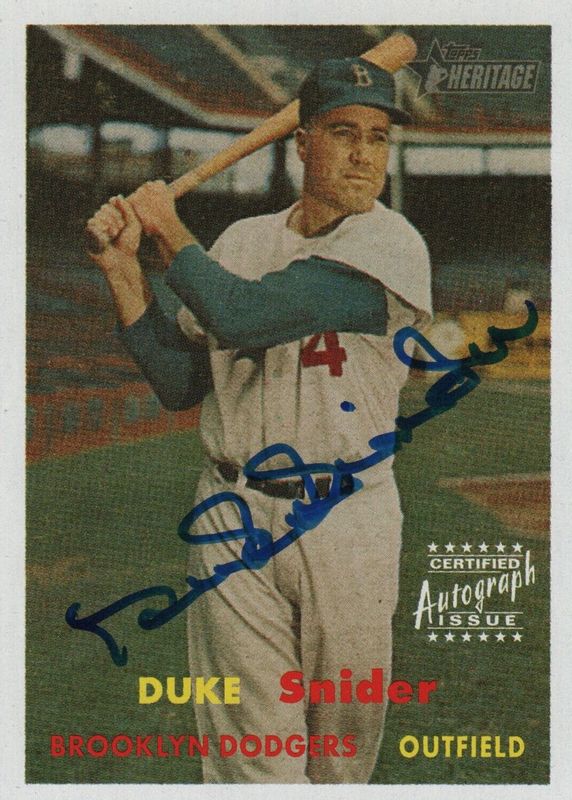 This card is 1 of 5 Duke Snider's card variations in the 2006 Topps Heritage set being tracked by Sports Card Investor, including Flashbacks Autographs, Flashbacks Autographs Seat Relics, Team Topps Autographs, and Real One Autographs - Red Ink /57.