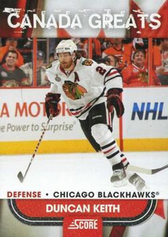 The Duncan Keith 2010 Score #11 Canada Greats card is 1 of 6 Duncan Keith's card variations in the 2010 Score set being tracked by Sports Card Investor, including Base, 20th Anniversary, French Back, Glossy, and Playoff Heroes.