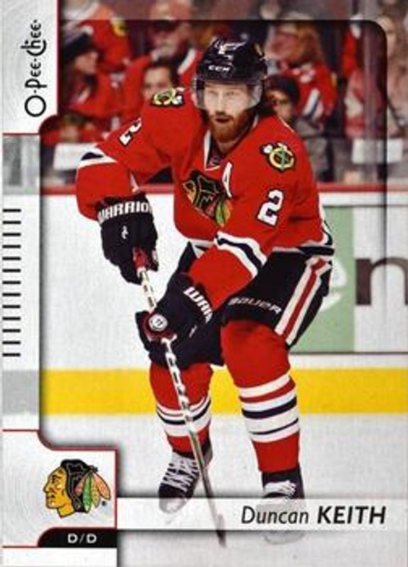 The Duncan Keith 2017 O-Pee-Chee #183 Base card is 1 of 6 Duncan Keith's card variations in the 2017 O-Pee-Chee set being tracked by Sports Card Investor, including Rainbow Foil, Red, Retro, Retro Blank Back, and Black Rainbow Foil /100.