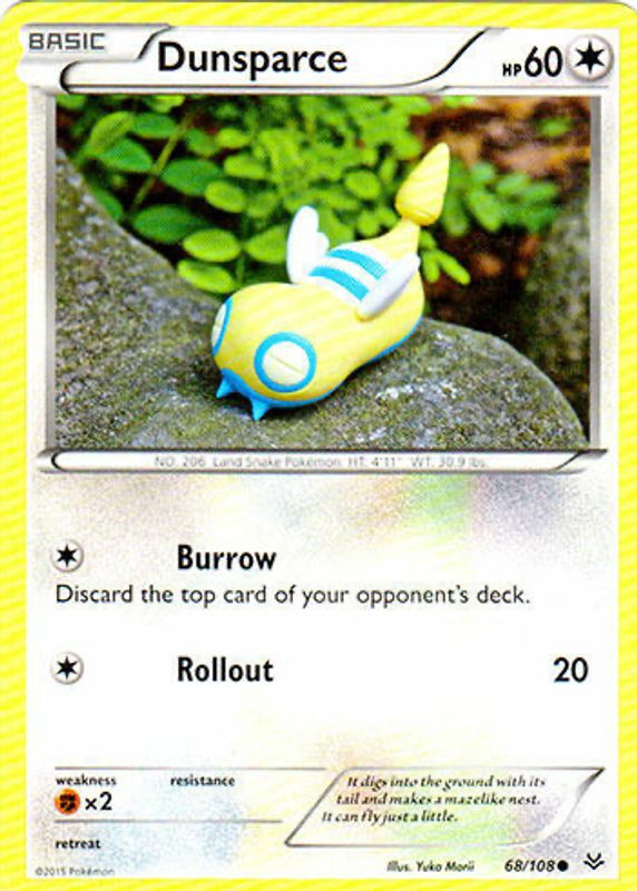 The Dunsparce 2015 XY: Roaring Skies #068/108 Base card in Raw TCG (Near Mint) condition has moved up $0.44 (+35.2%) in the last 30 days and was last sold for $1.69 .