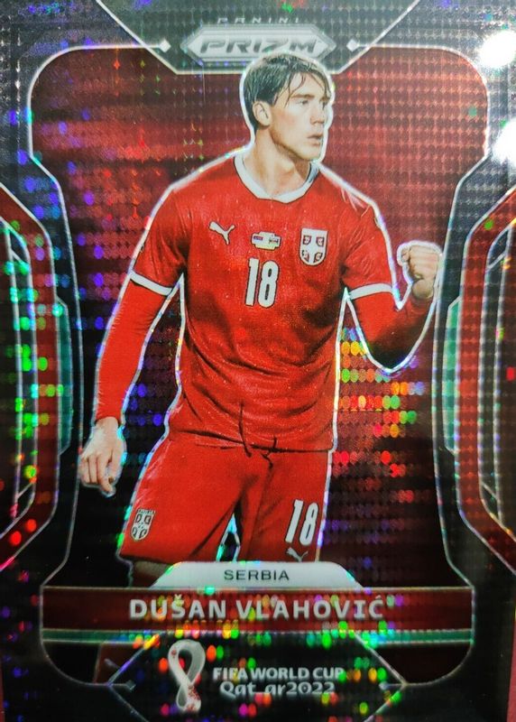 This card is 1 of 30 Dusan Vlahovic's card variations in the 2022 Prizm World Cup set being tracked by Sports Card Investor, including Red /399, Blue /299, Blue Wave /199, Purple /199, and Choice Blue /135.