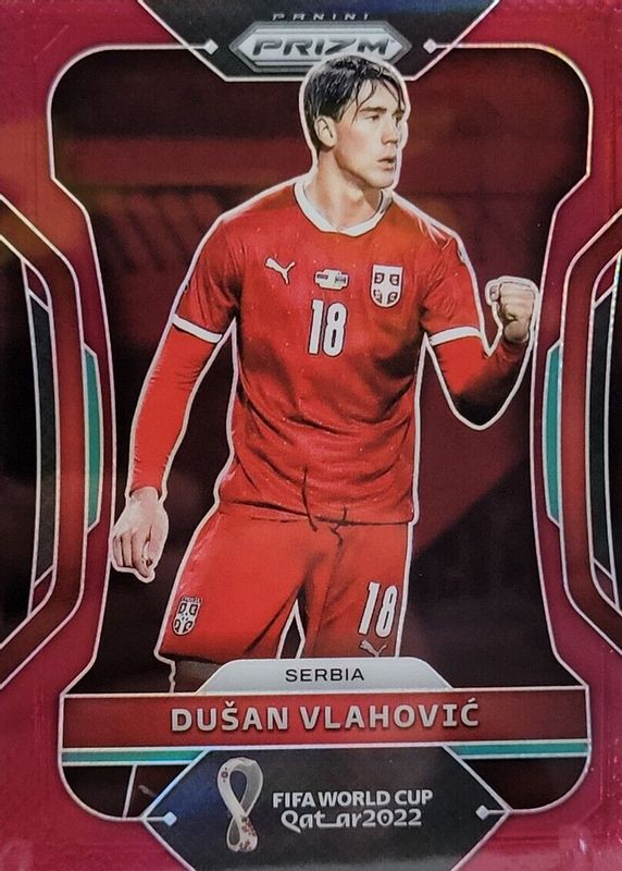 This card is 1 of 30 Dusan Vlahovic's card variations in the 2022 Prizm World Cup set being tracked by Sports Card Investor, including Red /399, Blue /299, Blue Wave /199, Purple /199, and Choice Blue /135.