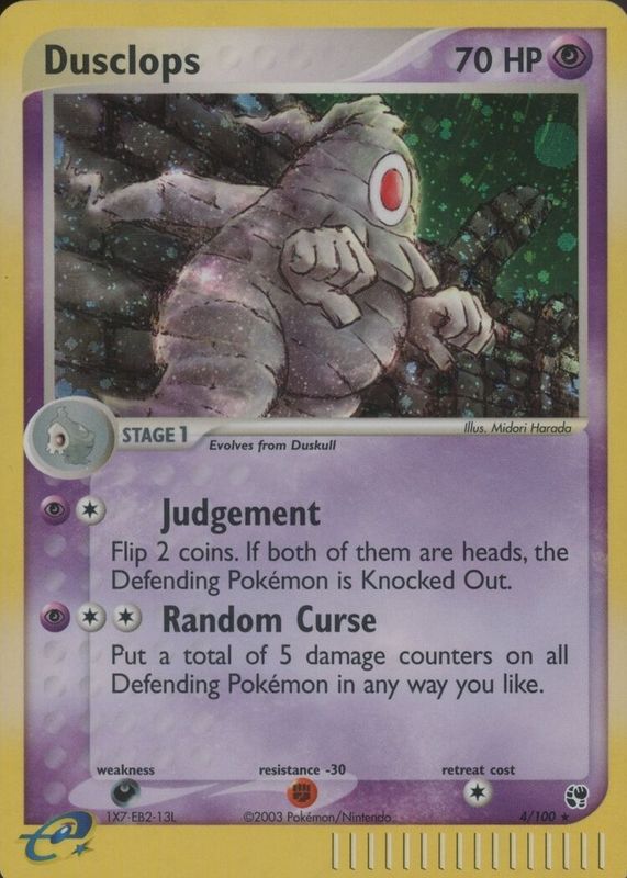 The Dusclops 2003 EX: Sandstorm #004/100 Holo card in Raw TCG (Near Mint) condition has moved down -$4.14 (-17.9%) in the last 30 days and was last sold for $19.00 .