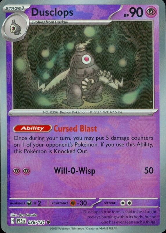 Dusclops 2025 Scarlet & Violet: Prismatic Evolutions #036/131 Master Ball Reverse Holo RAW TCG (LIGHTLY PLAYED) Price Guide