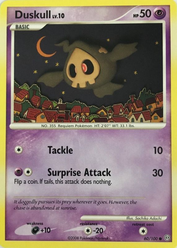 The Duskull 2008 Diamond & Pearl: Stormfront #060/100 Base card in Raw TCG (Near Mint) condition has moved up $0.58 (+19.2%) in the last 30 days and was last sold for $3.60 .