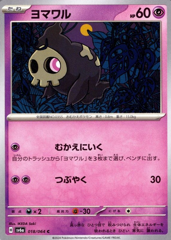 The Duskull 2024 Japanese Scarlet & Violet: Night Wanderer #018/064 Base card in Raw TCG (Near Mint) condition has not changed in price in the last 30 days and was last sold for $1.65 .