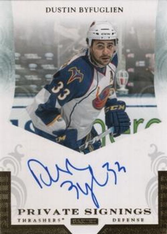 The Dustin Byfuglien 2010 Zenith #BYF Private Signings card is 1 of 5 Dustin Byfuglien's card variations in the 2010 Zenith set being tracked by Sports Card Investor, including Base /999, Red Hot, White Hot /25, and Private Signings Platinum /1.