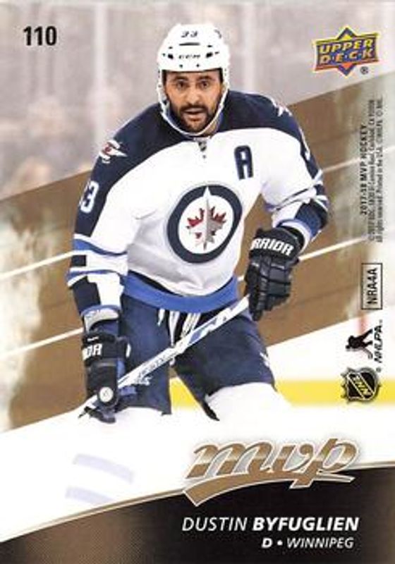 The Dustin Byfuglien 2017 Upper Deck MVP #110 Puzzle Backs card is 1 of 10 Dustin Byfuglien's card variations in the 2017 Upper Deck MVP set being tracked by Sports Card Investor, including Base, Green Script, Silver Script, Gold Script /100, and Super Script /25.