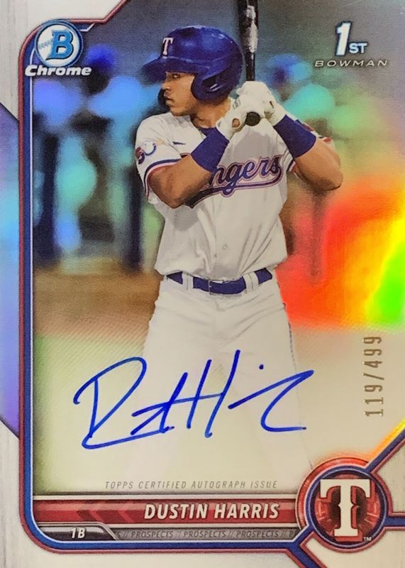 DUSTIN HARRIS 2022 1st Bowman Chrome Refractor AUTO /499 #CPA-DHR Rangers