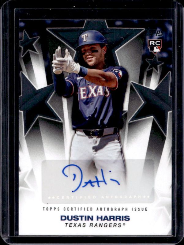 The Dustin Harris 2025 Topps #BSA2-DH Baseball Stars Autographs (Series 2) Rookie card is 1 of 75 Dustin Harris' card variations in the 2025 Topps set being tracked by Sports Card Investor, including Base, Aqua Holo Foil, Diamante Foil, Holo Foil, and Pink Diamante Foil.