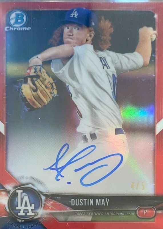 Dustin May 2018 Bowman Chrome #BCPA-DM Prospect Auto - Red Refractor /5 RAW Price Guide