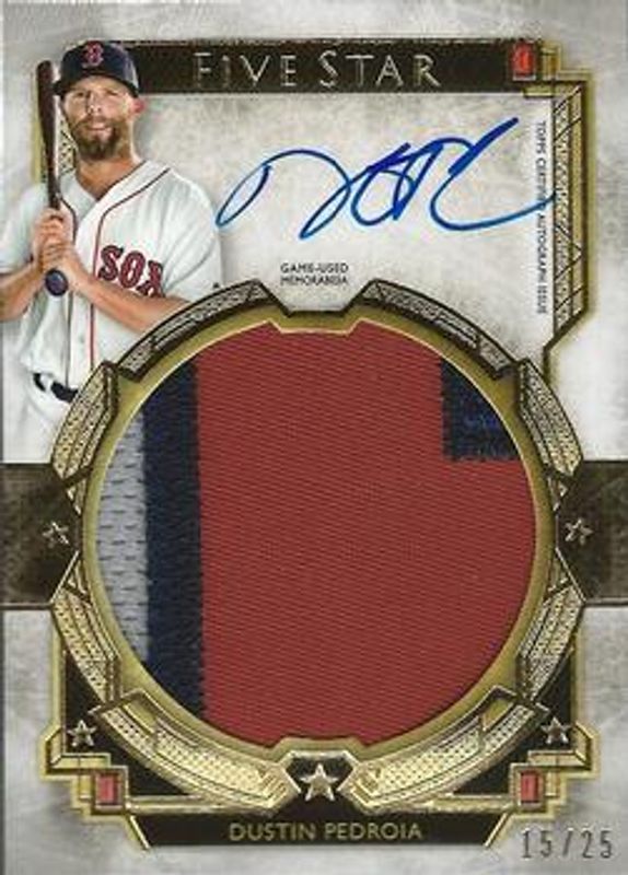 The Dustin Pedroia 2018 Topps Five Star #FSJP-DP Five Star Autographed Jumbo Patch /30 card is 1 of 16 Dustin Pedroia's card variations in the 2018 Topps Five Star set being tracked by Sports Card Investor, including Career Year Autographs /35, Golden Graphs /35, Five Star Autographed Jumbo Patch - Gold /25, Golden Graphs - Purple /25, and Golden Graphs - Blue /20.