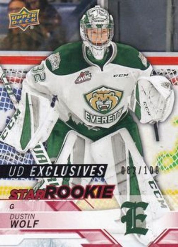 The Dustin Wolf 2018 Upper Deck CHL #366 Star Rookies UD Exclusives /100 card is 1 of 10 Dustin Wolf's card variations in the 2018 Upper Deck CHL set being tracked by Sports Card Investor, including Base, Silver, Star Rookies Midnight /25, Star Rookies High Gloss /10, and Printing Plates Black /1.