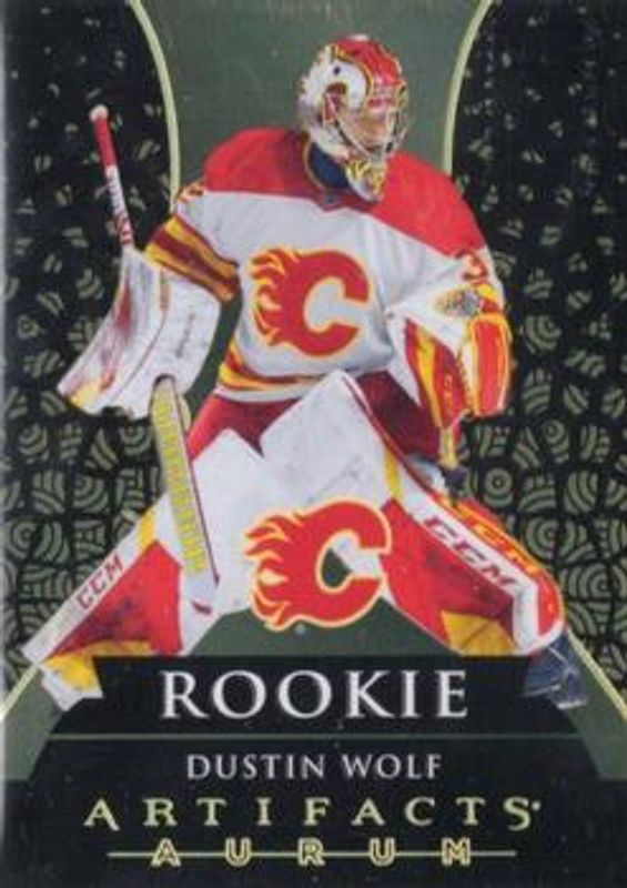 The Dustin Wolf 2023 Upper Deck Artifacts #A-33 Aurum Rookie card is 1 of 36 Dustin Wolf's card variations in the 2023 Upper Deck Artifacts set being tracked by Sports Card Investor, including Base /999, Leather, Plexi, Turquoise, and Wood.