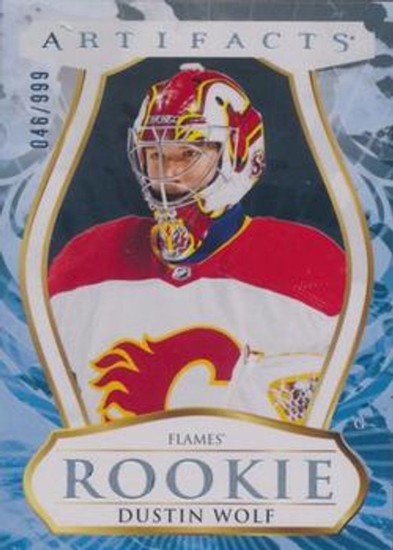 The Dustin Wolf 2023 Upper Deck Artifacts #182 Base /999 Rookie card is 1 of 36 Dustin Wolf's card variations in the 2023 Upper Deck Artifacts set being tracked by Sports Card Investor, including Leather, Plexi, Turquoise, Wood, and Ruby /499.