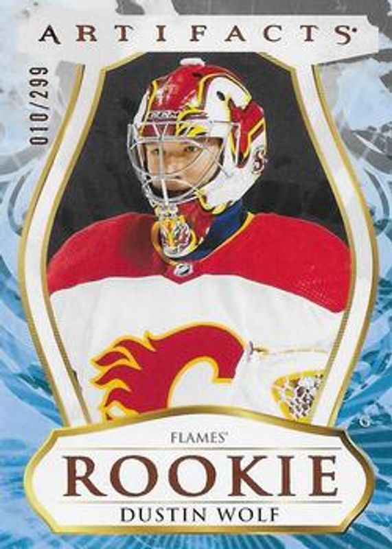 The Dustin Wolf 2023 Upper Deck Artifacts #182 Copper /299 Rookie card is 1 of 36 Dustin Wolf's card variations in the 2023 Upper Deck Artifacts set being tracked by Sports Card Investor, including Base /999, Leather, Plexi, Turquoise, and Wood.