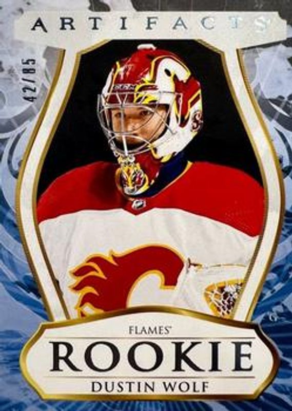 The Dustin Wolf 2023 Upper Deck Artifacts #182 Light Blue Steel /85 Rookie card is 1 of 36 Dustin Wolf's card variations in the 2023 Upper Deck Artifacts set being tracked by Sports Card Investor, including Base /999, Leather, Plexi, Turquoise, and Wood.